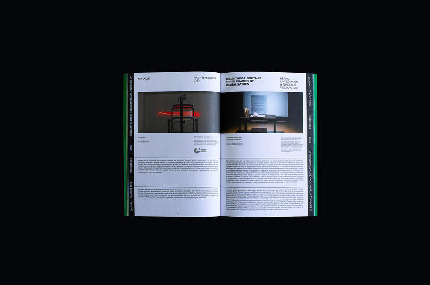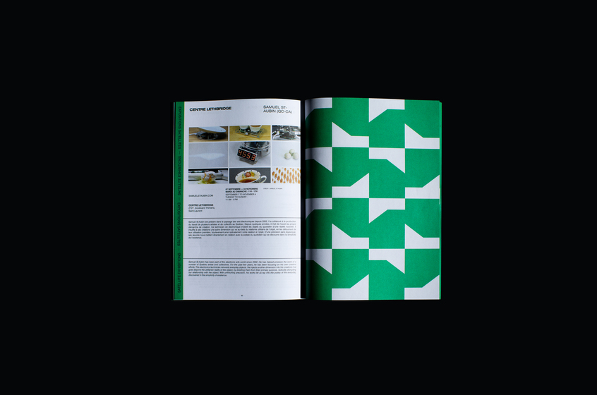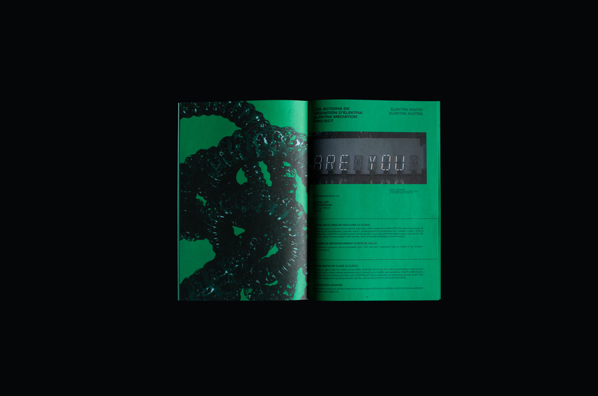 Le Studio a concentré son approche visuelle autour d’une œuvre performative, ΠTON de Codact.ch, une sorte de tube de Möbius organique, de boyau en caoutchouc réagissant aux sons. Nous avons réinterprété les images de cet invertébré électronique dans une déclinaison de situations : enfermé dans un sac plastique, perforé, modifié de texture et de couleur. L’ensemble de l’édition se distingue par sa palette de vert, noir et blanc.