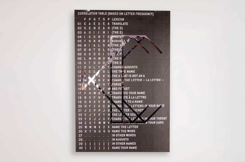 Created in close collaboration with Montreal poet Steve Savage, this project is a tribute to the Brazilian poet Augusto de Campos, one of the inventors of concrete or "verba-voco-visual" poetry. We produced a series of posters visualizing the process employed by Savage to translate an original text by de Campos into six languages. During the exhibition in New York, three posters were displayed on the wall. Some 60 posters were shown to visitors on the ground.