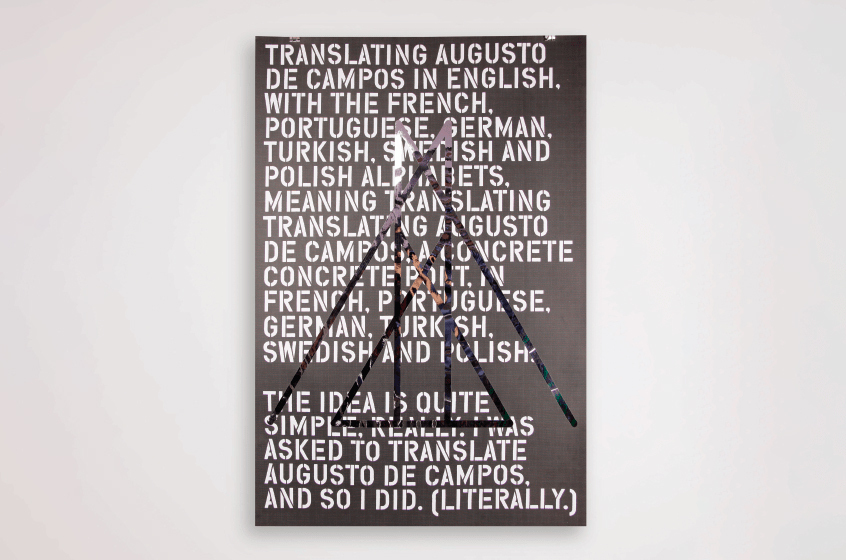 The method of translation was to replace each letter of a given text with a word or a group of words. The variations from one language to the next depended on the frequency of the letters in each language. For the graphic version, six elements representing the first three letters of Augusto de Campos and the three pages required for translation formed six images, which were combined in multiple ways to produce some 60 variations in black and white.