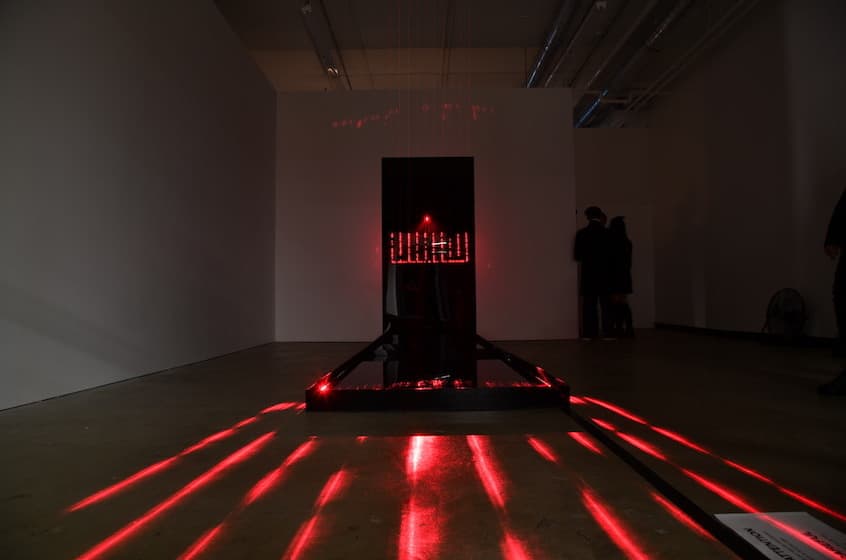 "Laser Like Water" is a digital art installation created by Baillat Studio, Jean-Sébastien Baillat, Patrick Trudeau, and Ottomata. The project was intended as a meeting of various elements that together give rise to new perceptions of those same elements only possible as a result of their amalgamation. The piece is composed of brightly-coloured lasers and shining ropes that slice through the air, fall apart upon contact with water, then are reflected and deposited onto a mirrored screen ultimately resulting in the creation of new abstract forms.